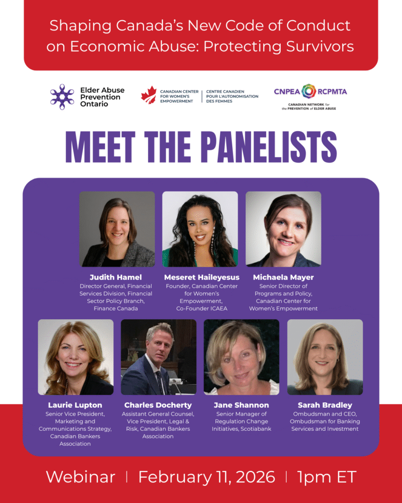 Bank representatives will share insights into current practices under the seniors’ code, while survivors will offer lived expertise from both senior abuse and domestic/economic violence perspectives. Together, the panel will assess the real-world impact of the seniors’ code, highlight best practices, and identify lessons that can guide the development of the new economic abuse code of conduct.