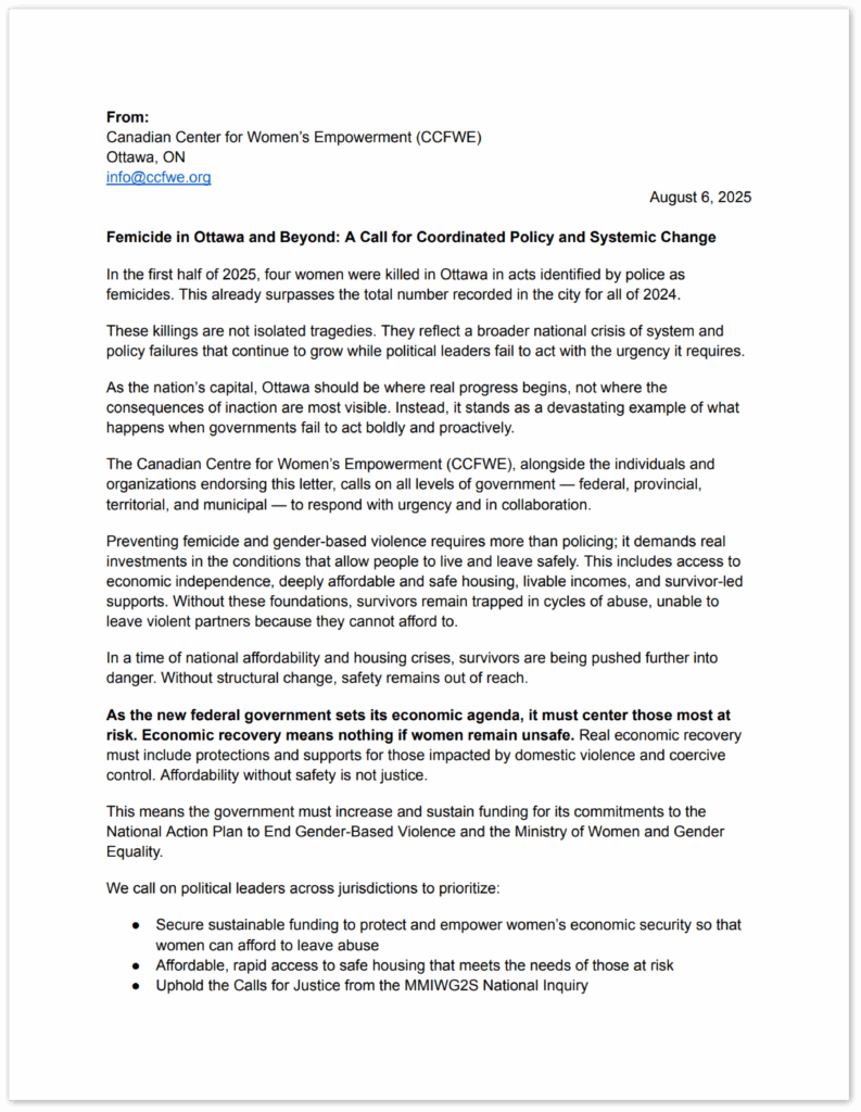 The letter and brief below, Femicide in Ottawa and Beyond: A Call for Coordinated Policy and Systemic Change, outline clear actions for governments to protect lives and advance real safety for women across Canada.