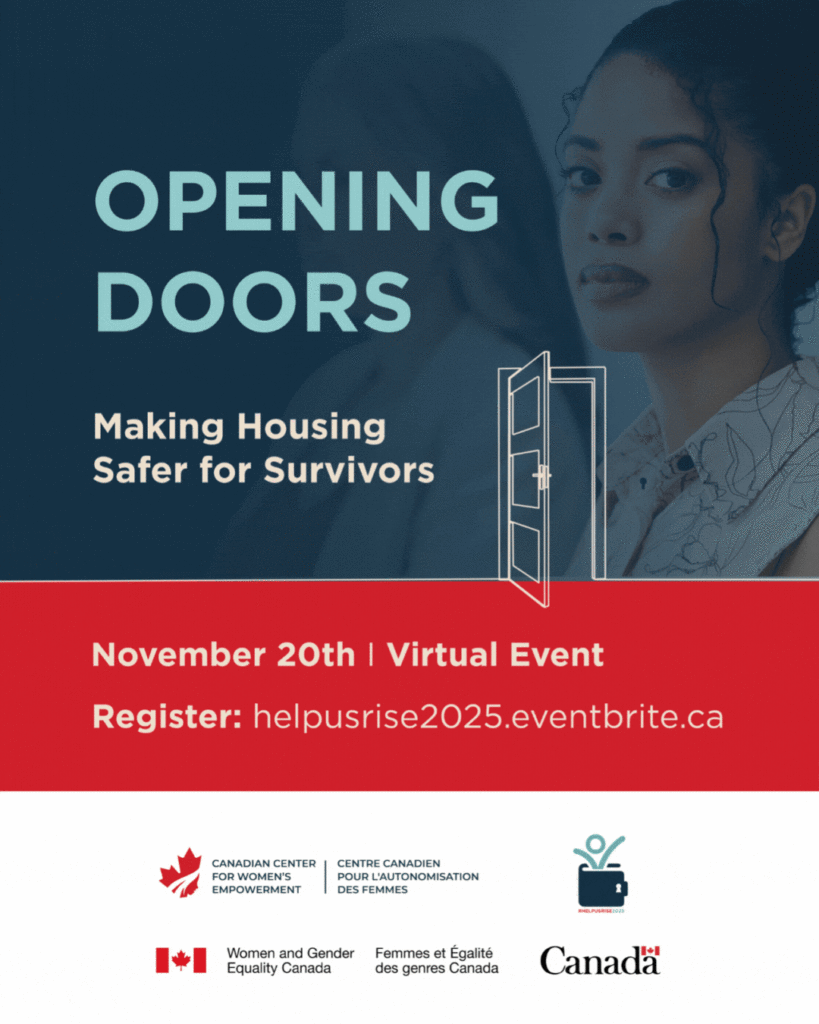 Join the Canadian Centre for Women’s Empowerment (CCFWE) for an important national webinar exploring the connection between economic abuse, housing insecurity, and survivor empowerment. As part of Help Us Rise, CCFWE’s annual campaign to end economic abuse, this session will spotlight how housing access and stability are vital to breaking the cycle of abuse and rebuilding financial independence.